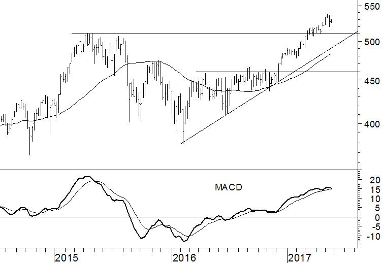 Voorlopig zien wij geen beren op de weg omhoog die de AEX-index nog heeft af te leggen. Het technische beeld is uitstekend, zeker nadat in maart de weerstand rond 510 werd gebroken. Het meerjarige hoogtepunt dat hiermee werd bereikt is een teken van kracht. De kleine correctie die de AEX-index op dit moment doormaakt, brengt geen schade toe aan het positieve trendbeeld.