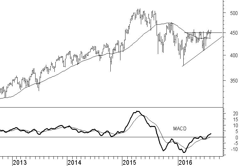Al wekenlang blijft de AEX-index in de buurt van het 450-niveau. Deze weerstand houdt het hele jaar al een verdere opmars tegen. Soms beweegt de beursgraadmeter eronder en soms iets erboven. Voorlopig heeft de AEX-index nog niet overtuigend afstand genomen van de weerstand rond 450, maar er zijn steeds meer voortekenen voor een succesvolle doorbraak. Zo neemt de onderliggende MACD-indicator wel duidelijk afstand van de nullijn en dat wijst op een positief momentum. Ook het feit dat de AEX-index al meerdere weken boven het 40-weeks gemiddelde blijft is bemoedigend. Een hart onder de riem geeft de Duitse DAX-index, die als eerste Europese index wél een duidelijk jaarrecord vestigt. En goed voorbeeld doet goed volgen. Zeker als het om de belangrijke oosterbuur gaat. In de komende weken verwachten wij dan ook dat de AEX-index zich opmaakt voor een beweging naar 475.