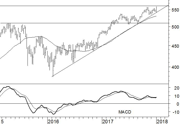 De komende weken zullen duidelijkheid moeten verschaffen wat betreft de koersrichting. In ieder geval zal een overtuigende doorbraak boven 560 een belangrijke impuls geven aan de huidige stijgende trend. Wanneer dat gebeurt is dus nog even de vraag, maar het staat zeker op de agenda voor 2018.