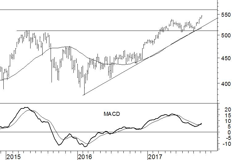 Uiteindelijk moet het al vaak door ons genoemde koersdoel op 560 haalbaar zijn. Zeker nu het momentum een impuls krijgt, getuige de opwaartse kruising van de MACD-indicator, kan het koersdoel snel worden bereikt. Aan de onderkant schuift het gecombineerde steunniveau van de gemiddeldelijn en de steunlijn op naar 525. Voorlopig kijken wij echter liever omhoog dan omlaag.