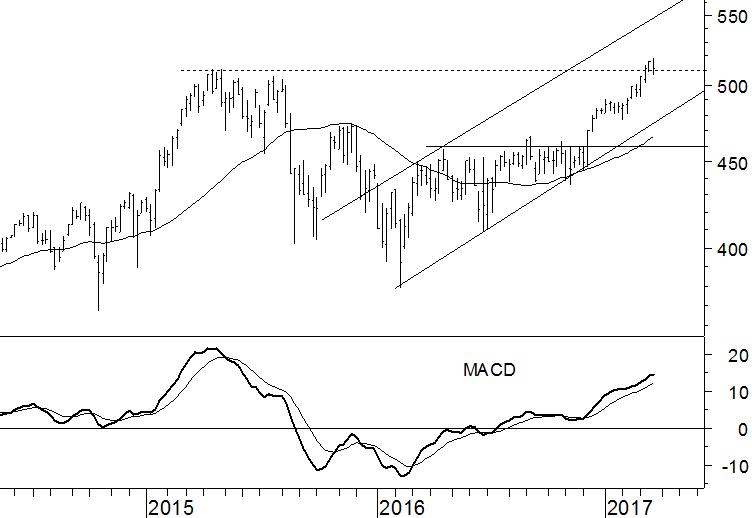Zorgen over het technische beeld hebben wij echter niet. Een eventuele correctie schept juist kansen om op een lager niveau in te stappen. Een uiterste, laagste grens daarvoor is de onderkant van het trendkanaal rond 480. Onder dat niveau sneuvelt het positieve trendbeeld. Voorlopig is dat niet aan de orde en wachten wij af of de stijgende trend op korte termijn wordt bevestigd. Op termijn is een beweging naar 550 waarschijnlijker dan een terugval naar 520.