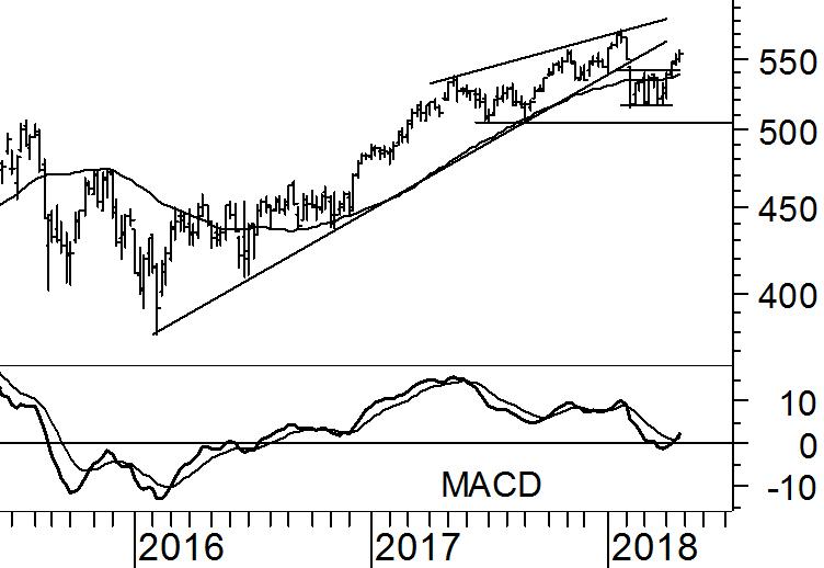 Een andere optie is de vorming van een hogere bodem die dan idealiter boven de 530 zou moeten uitkomen. Positief is wel dat MACD-trendindicator zich boven de nullijn lijkt te handhaven. We zijn voorzichtig optimistisch.