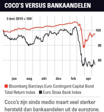 Tegelijkertijd werd banken opgelegd het dividend uit te stellen. Dat is de reden dat de index van coco’s sinds medio maart zo veel sterker is hersteld dan de index van bankaandelen uit de eurozone (zie grafiek). Volgens UBS zijn er als gevolg van de maatregelen van de Europese autoriteiten de komende drie tot zes maanden geen afschrijvingen of conversies van de coco’s te verwachten. Het effectief rendement op de coco-index is dan ook bijna gehalveerd van een paniekniveau van 15,5% medio maart tot 8,2%. Dat is echter nog wel drie keer zo hoog als medio februari. Het is een signaal dat de zorgen over de banksector ondanks alle steun zeker nog niet zijn weggenomen.
