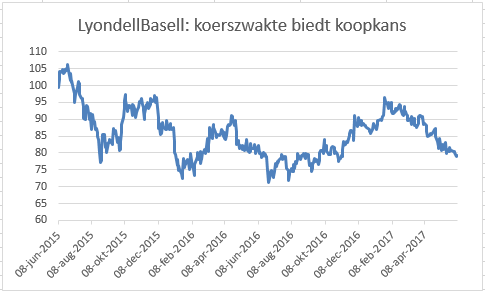 Chemiereus LyondellBasell, eerder opgenomen in de dividendportefeuille en nog altijd één van de uitblinkers in onze offensieve portefeuille, verhoogt het dividend met 6% tot $0,90 per aandeel. Na een zeer succesvolle periode op de beurs zit het aandeel eigenlijk al vanaf eind 2014 in een neerwaartse trend. Dit jaar daalt Lyondell 7,7% op een koers van $79,14. Hierdoor is het dividendrendement opgelopen tot 4,6%.