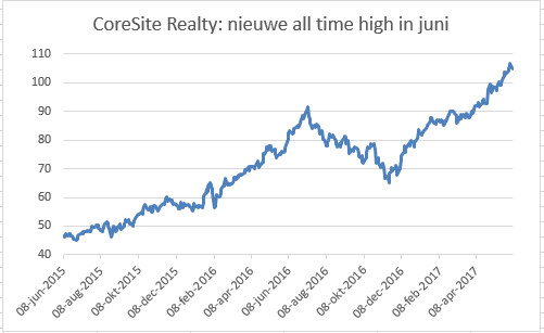 Data center Real Estate Investment Trust (REIT) CoreSite Realty, sinds 8 maart opgenomen in de dividendportefeuille, verhoogt opnieuw het dividend, ditmaal met 12,5% naar $0,90 per kwartaal. Precies een half jaar geleden werd het dividend nog met ruim 50% verhoogd door CoreSite, dat waarschijnlijk later dit jaar nog een keer het dividend met dubbele cijfers gaat verhogen. Dat is ongekend, zeker voor een aandeel met een dividendrendement van nog steeds 3,4%. Voor de dividendportefeuille is CoreSite binnen drie maanden goed voor een rendement van 22,5%. Het aandeel sloot maandag op $104,84 (+32% in 2017) en noteert daarmee niet ver van de hoogste koers ooit van $107,36 die vorige week (2 juni) werd aangetikt.