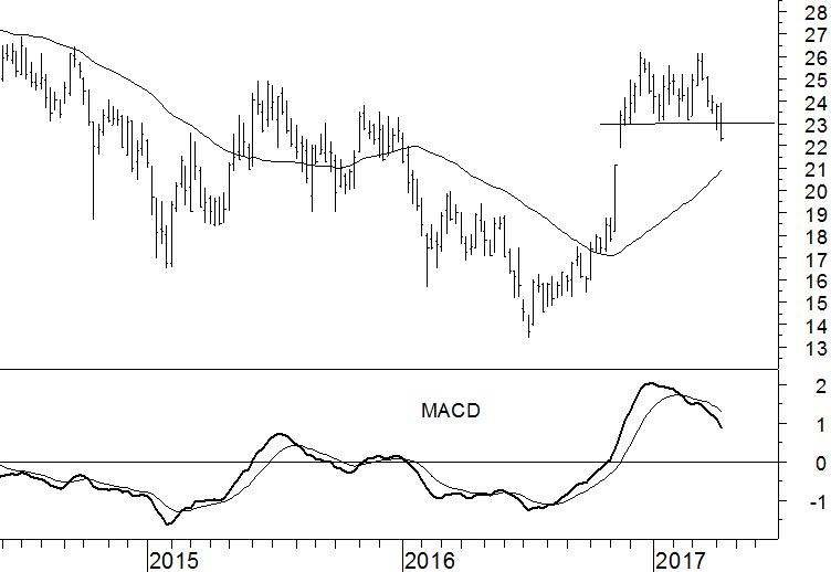 Dat maakt dat de opmars in de Amerikaanse 10-jaars rente die medio 2016 werd ingezet is gekeerd. In de weekgrafiek is een toppatroon zichtbaar met de doorbraak van het steunniveau op 2,3%. Het volgende richtpunt is het 40-weeks gemiddelde op 2,1%. De kans is groot dat dit niveau binnen enkele weken wordt bereikt. Ook de MACD-indicator geeft aan dat het voorbij is met de stijgende rente. Aandelensectoren als vastgoed en nutsbedrijven komen hierdoor weer in de belangstelling. Maar ook een belegging in US Treasuries kan geld opleveren.