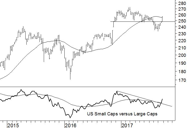 Bemoedigend is verder dat Amerikaanse smallcaps het weer beter doen dan de largecaps, zoals blijkt uit de onderliggende relatievesterktelijn. Zeker wanneer de zwakte van de Amerikaanse dollar van het laatste halfjaar tot stilstand komt, verbetert het perspectief van deze in Nederland verhandelde indextracker aanzienlijk. Een positie in kleinere aandelen binnen de Amerikaanse portefeuille is weer actueel.