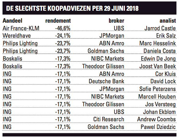 Altice, FlowTraders, AMG, Philips en ASML vormde dus het winnende kwintet in het eerste halfjaar. Het vijftal grote verliezers bestaat uit ING, Boskalis, Philips Lighting (dat inmiddels door het leven gaat onder de naam Signify), Wereldhave en Air France-KLM. Acht bankenanalisten hadden ING de gehele periode op ‘kopen’ staan. Twee bevolen er Boskalis aan en twee Philips Lighting. Eén analist was een korte periode enthousiast over Wereldhave. Een andere bleef tot het einde toe enthousiast over Air France-KLM.