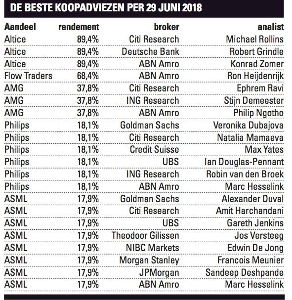 Altice, FlowTraders, AMG, Philips en ASML. Wie dat vijftal AEX en AMX-aandelen sinds eind vorig jaar in portefeuille had, boekte in de eerste zes maanden van 2018 een prima beleggingsrendement. Maar liefst acht bankenanalisten plaatsten inderdaad voor dit jaar ASML op hun favorietenlijstje. Zes deden dat bij Philips. Ook hadden drie marktvorsers van binnen- en buitenlandse banken begin dit jaar AMG en Altice op ‘kopen’ staan. Slechts één was er zo goochem Flow Traders bij zijn klanten aan te bevelen.