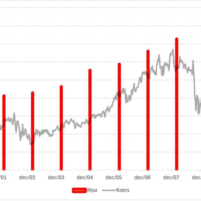 Zelfs aandelen van bedrijven met de meest stabiele bedrijfsmodellen gaan soms keihard onderuit. Air Liquide, de Franse producent van industriële gassen, is zo’n bedrijf. In de afgelopen dertig jaar is de aangepaste winst per aandeel van Air Liquide slechts een keer gedaald en dat was ook nog eens een gevolg van een specifieke belastingmaatregel in de VS. Zelfs tijdens de grote financiële crisis in 2008/09 hield Air Liquide de winst stabiel en in de implosie van de technologiebubbel steeg de winst zelfs lichtjes (zie grafiek).