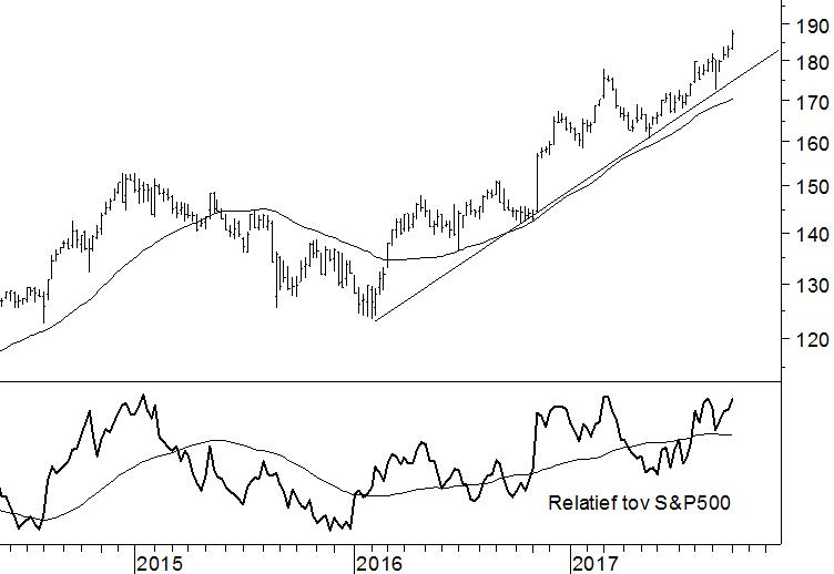 Berkshire Hathaway (BRK) vestigt regelmatig een vers koersrecord. Het aandeel bevindt zich al sinds begin 2016 in een patroon van hogere toppen en bodems. In die tijd is zelfs het 40-weeks gemiddelde geen enkele keer doorboord. Warren Buffett heeft het vertrouwen van beleggers niet beschaamd. Echter, gelet op een tijdspanne van meerdere jaren is er geen sprake van een buitengewone prestatie.