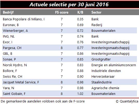 De tien punten komen in grote lijnen overeen met de negen stappen van de F-score. Voor elk criterium waarop het bedrijf goed scoort, krijgt het een punt, anders niet. De som van de binaire signalen varieert dus van 0 tot 10 en alle laag gewaardeerde aandelen die een zeven of hoger scoren zijn in beginsel koopwaardig.