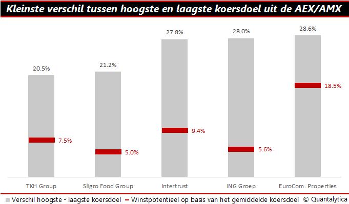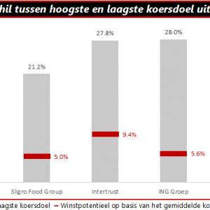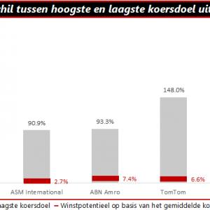 Indien u voortaan bij de selectie van aandelen het koersdoel erbij betrekt, kijk dan ook even naar het verschil tussen het hoogste en laagste koersdoel. Geef de voorkeur aan aandelen met een kleine spreiding en laat de aandelen met een groot verschil links liggen.