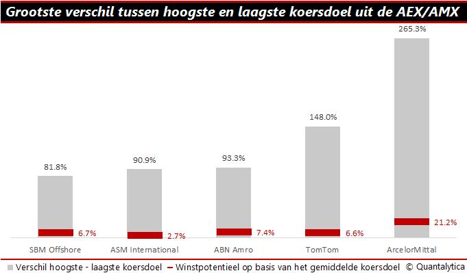 En soms liggen de koersdoelen zo ver uiteen dat een paard er de hik van krijgt. Het verschil tussen het hoogste en het laagste koersdoel bedraagt soms meer dan 100%. Neem de indexleden van de AEX: bij staalproducent ArcelorMittal is het verschil tussen de hoogste en laagste koers 265,3% groot, bij ING daarentegen is dat nauwelijks 28%.