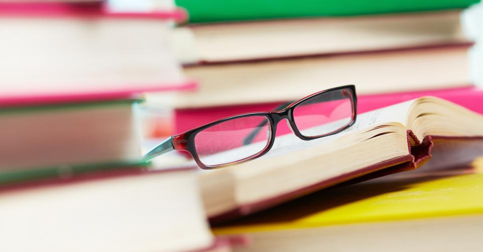 Close-up image of eyeglasses among piles of books
