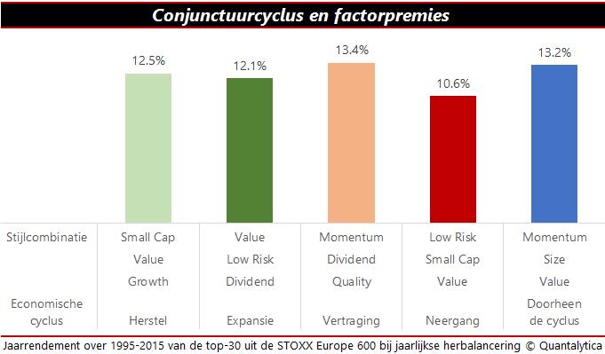 Als u perfect aanvoelt hoe de economie ervoor staat, dan kunt u mee surfen op de golfbeweging van de conjunctuur en stelt u hierop uw risicobronnen bij. Cryptisch omschreven liet u in 2015 uw oog vallen op hoogstaande dividendaandelen. Vorig jaar sprokkelde de combinatie van kwaliteit, dividend en momentum een toprendement bijeen van 23,4%, maar nu komt die niet verder dan -0,2%. Het trio dat dit jaar tot dusver het hoogste rendement biedt (1,5%) is dividend, low-vol en waarde, oftewel de hekkensluiter uit 2015. Dit toont aan dat 2016 een moeilijk beursjaar is.