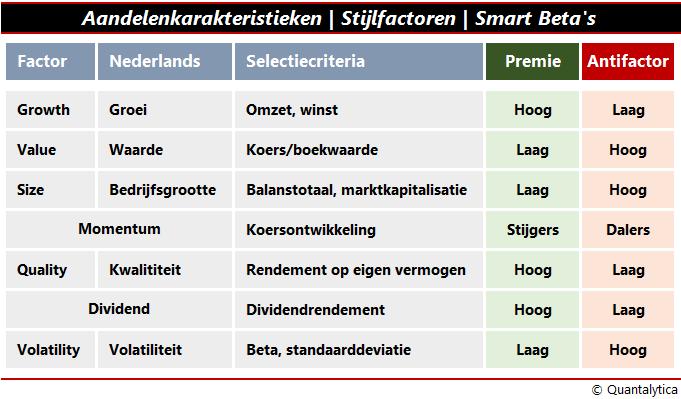Vroeger sprak men van aandelenkarakteristieken, later van stijlfactoren, tegenwoordig van factorbeleggen. Hetzelfde fenomeen staat ook bekend als Evidence Based Investing of Smart Beta. Een term die de laatste tijd de kop opsteekt is factorpremie, een verbastering van risicopremie en factorbeleggen. Premies zijn immers veelal een beloning voor het nemen van, of een compensatie voor de blootstelling aan risico.