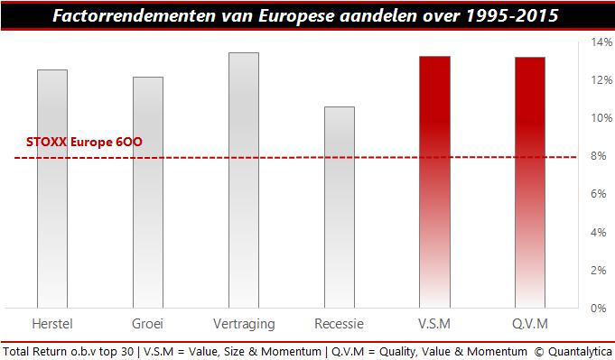 Eigenlijk moet de computer zo worden geprogrammeerd dat als de economie herstelt u aandelen sorteert op basis van bedrijfsgrootte, groei en waarde. Zodra de economie weer op stoom is, verschuift de aandacht van beleggers naar waarde, dividend en volatiliteit. Op het moment dat de economische groei begint te vertragen, dan gaat de voorkeur uit naar dividend, momentum en kwaliteit als stijlfactor. En wanneer er sprake is van een recessie, dan zijn waarde, dividend en volatiliteit de belangrijkste factorpremies.