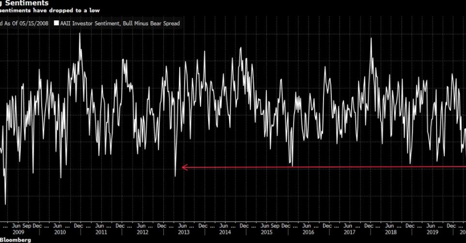 Het beleggerssentiment is volatiel. De lijn die het verschil tussen de optimisten (bulls) en de pessimisten (bears) weergeeft, flitst flink op en neer in onderstaande Bloomberg-grafiek. Op dit moment overheersen de pessimisten onder de beleggers. Er is een waarde bereikt die dicht in de buurt ligt van het diepste punt in 2013 en wellicht is het sentiment op weg is naar een ander dieptepunt, dat van begin 2009. Maar het kan verkeren, getuige de vele bewegingen omhoog.