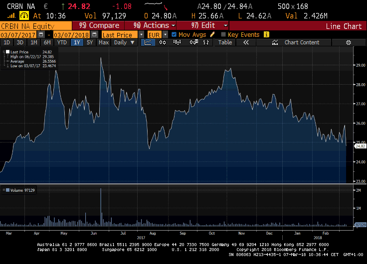 Corbion is vandaag met afstand de grootste daler van alle AEX- en AMX aandelen. Het aandeel deed het de afgelopen jaren prima, maar verliest in 2018 inmiddels 7,4% op een koers van €25. Analisten blijven wel positief met vier koopadviezen, vier houdadviezen en geen enkel verkoopadvies.