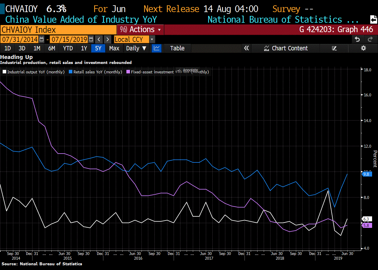 De Chinese economie vertoont enige groeivertraging, maar de economische groei bedraagt toch nog 6,2% (van april tot en met juni). De industriële productie blijft goed overeind op ruim 6%. De investeringen in gebouwen en machines (fixed asset investment) daarentegen vertonen een dalend beeld, net als de retailverkopen (zie grafiek). Deze daling wordt geweten aan het handelsconflict met de VS, maar hij is al eerder gestart. Het is bovendien logisch dat hoge groeicijfers geleidelijk dalen.