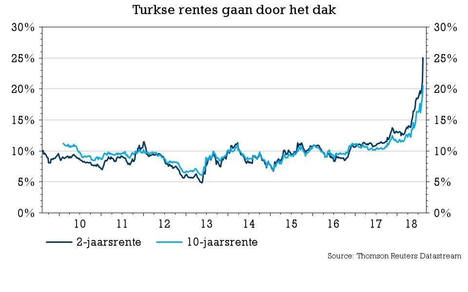 Door de onrust in Turkije staat de Turkse 2-jaarsrente op 25% en de 10-jaarsrente op 21%.