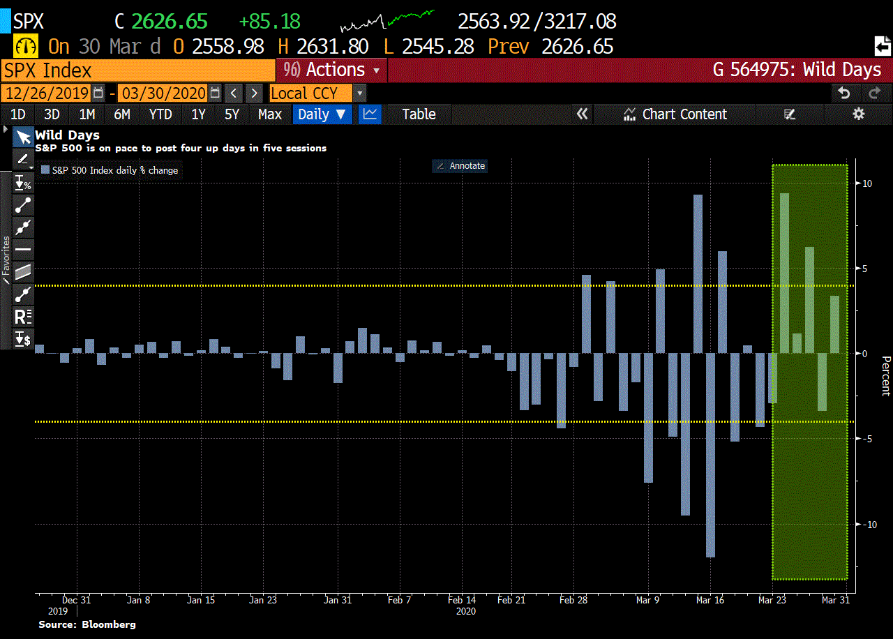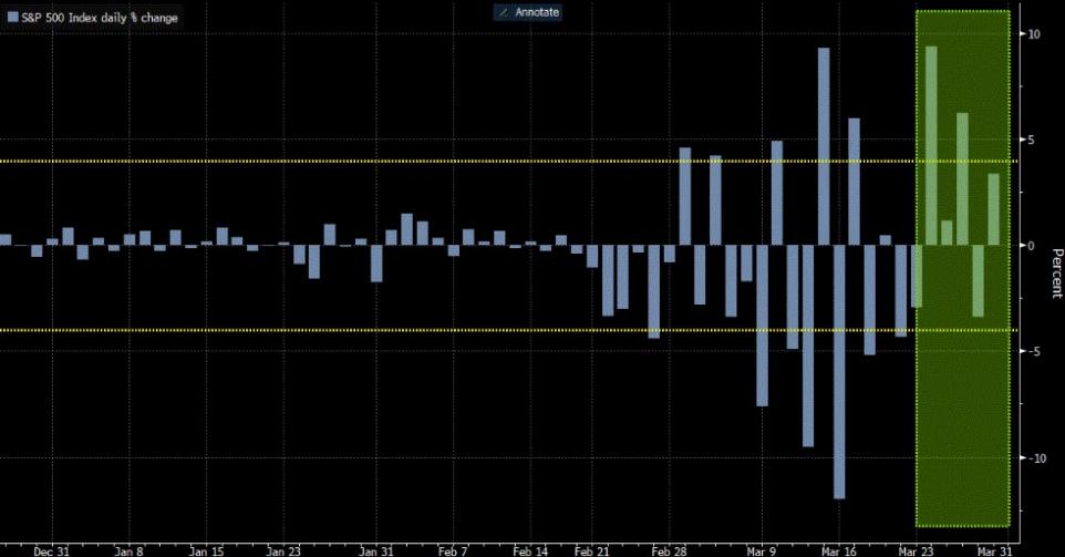 De Bloomberg-grafiek bevestigt het beeld dat bij de Dow Jones-index is geschetst: de beurzen lijken de problemen rond corona en de recessie wat van zich af te schudden. Na een flinke daling zijn de aandelen de laatste vier van de vijf handelsdagen weer wat aan het stijgen.