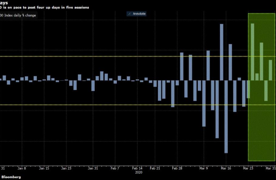 De Bloomberg-grafiek bevestigt het beeld dat bij de Dow Jones-index is geschetst: de beurzen lijken de problemen rond corona en de recessie wat van zich af te schudden. Na een flinke daling zijn de aandelen de laatste vier van de vijf handelsdagen weer wat aan het stijgen.