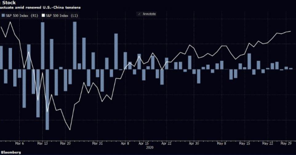 In onderstaande Bloomberg-grafiek wordt de koersontwikkeling van de S&P 500-index (de lijn) afgezet tegen de fluctuaties van de koersen van dezelfde index (de staafjes). Duidelijk zichtbaar is dat de reacties op bijvoorbeeld de spanningen met China steeds minder heftig worden. De recente inperking van de handelsvoordelen van Hongkong door de VS en de reactie van China om de importen uit de VS te verlagen, had bijvoorbeeld nauwelijks