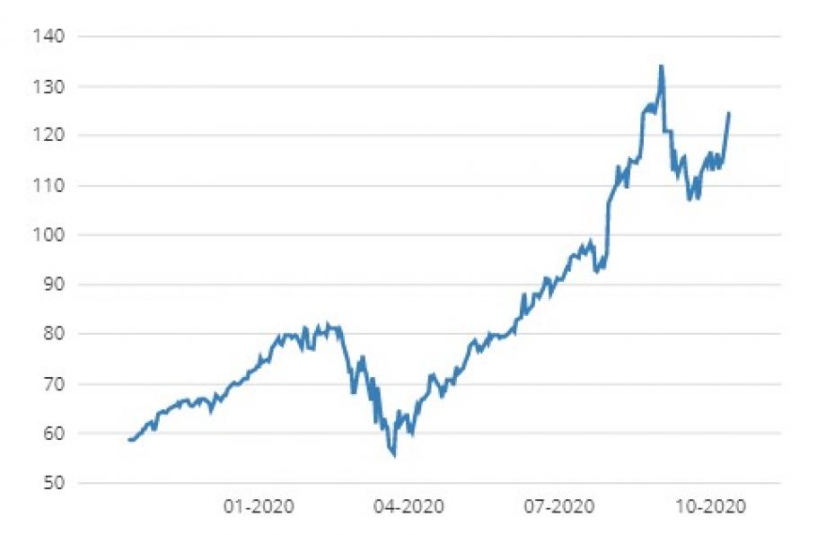 Apple presenteert vandaag een nieuwe iPhone. Verwacht wordt dat 5G-toepassingen er een belangrijke rol in gaan vervullen. Ook werd bekend dat Chinese toeleveranciers bij de productie overuren hebben gemaakt door in vakantietijd door te werken. De verwachtingen zijn dus hooggespannen. De koers van het aandeel ging er gisteren in ieder geval met 6,4% door omhoog. Daarmee herstelt de koers van een dip en lijkt het de stijgende trend te hervatten.