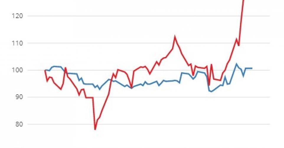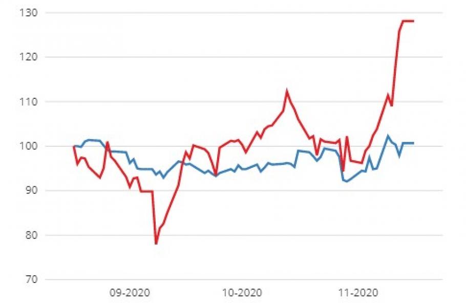 Het positieve nieuws over succesvolle coronavaccins neemt toe, waarbij naast Pfizer nu ook Moderna een effectief vaccin zou hebben ontwikkeld. Ik heb de aandelenkoersontwikkelingen van de twee bedrijven naast elkaar gezet, en dat beeld geeft opvallende verschillen te zien. Deze maand is Moderna aanzienlijk harder gestegen dan Pfizer.