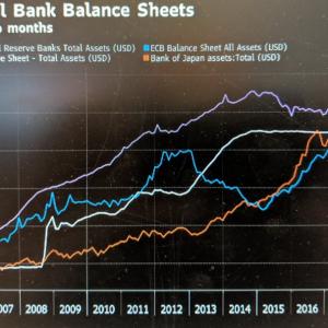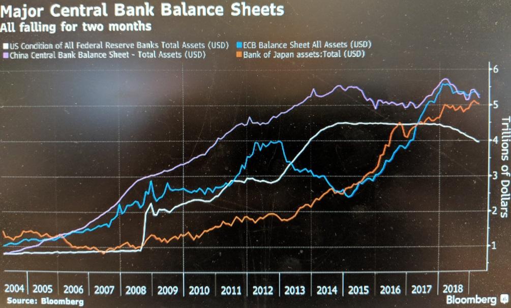 Februari en maart waren de eerste twee maanden achter elkaar in minimaal 15 jaar dat de opgestelde balans van de centrale banken van de VS, Eurozone, Japan en China kromp. Het record van de balans was in maart 2018 en de all time high van de wereldwijde aandelenmarkt was jan 2018.