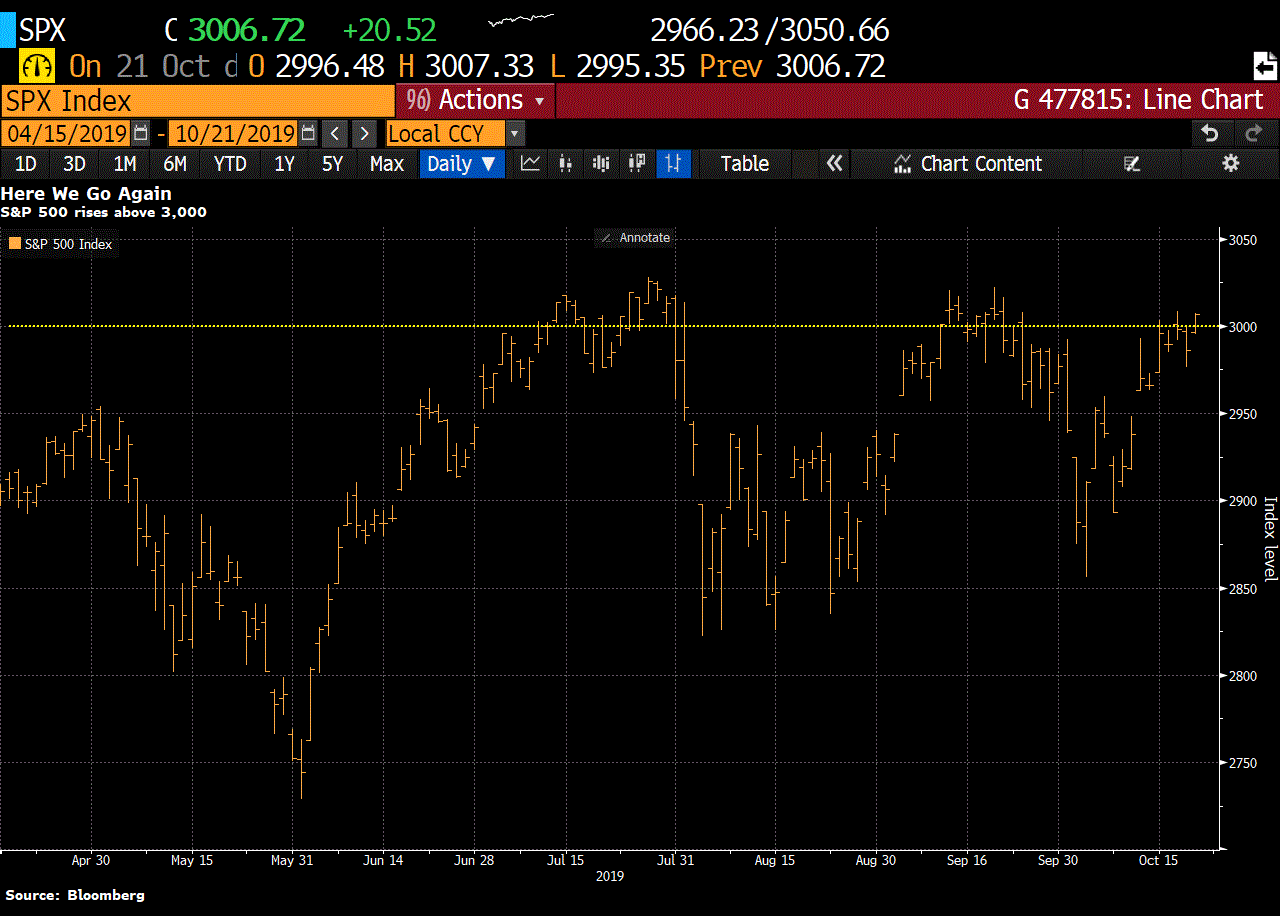 De S&P500-index schurkt in deze Bloomberg-grafiek weer tegen de 3000 aan. Dit geeft aan dat de beleggers optimistisch zijn, met name door de handelsbesprekingen tussen de VS en China. Analisten zijn deze week juist pessimistischer geworden: zij hebben hun schattingen voor de gecombineerde S&P-index (bedrijfs-)winsten in 2020 andermaal naar beneden bijgesteld. Dat doen ze al het hele jaar. Deze week ging die schatting met $1 naar beneden, naar $178,40. Januari 2019 kende de laatste verhoging, naar circa $191.
