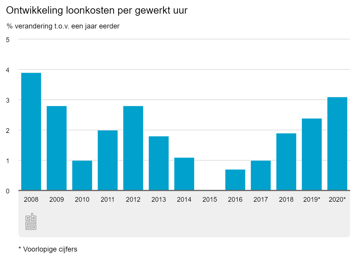 Uit cijfers van het Centraal Bureau voor de Statistiek blijkt vrijdag dat het afgelopen jaar de grootste loonkostenstijging over de afgelopen twaalf jaar plaatsvond. Per gewerkt uur van werknemers stegen de loonkosten in 2020 op jaarbasis met 3,1%.