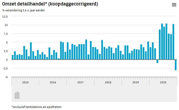 Uit cijfers die het CBS vrijdagochtend naar buiten bracht, wordt duidelijk dat de Nederlandse detailhandel het afgelopen jaar 5,9% meer omzet heeft gerealiseerd dan in 2019. Dit betekent de op een na hoogste omzetgroei in deze eeuw – alleen in 2001 was de omzetstijging met ruim 6% groter. Wel wijst het statistiekbureau erop dat afgelopen december de detailhandel een omzetverlies leed van 3,1%.