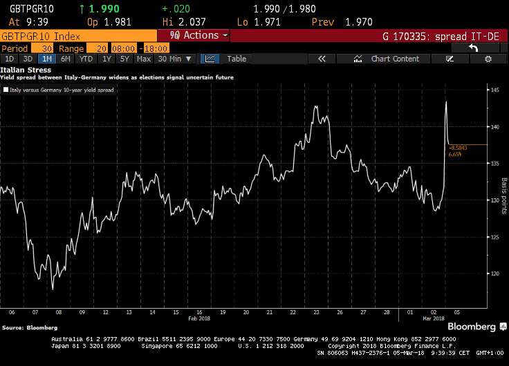 De uitslag van de Italiaanse verkiezingen, waar de Vijfsterrenbeweging de grootste partij lijkt te worden, maakt beleggers ongerust. Een lange regeringsformatie ligt voor de hand. De spread tussen de Duitse en Italiaanse tienjaarsrente vertoont vandaag een duidelijke piek in het nadeel van de Italianen: