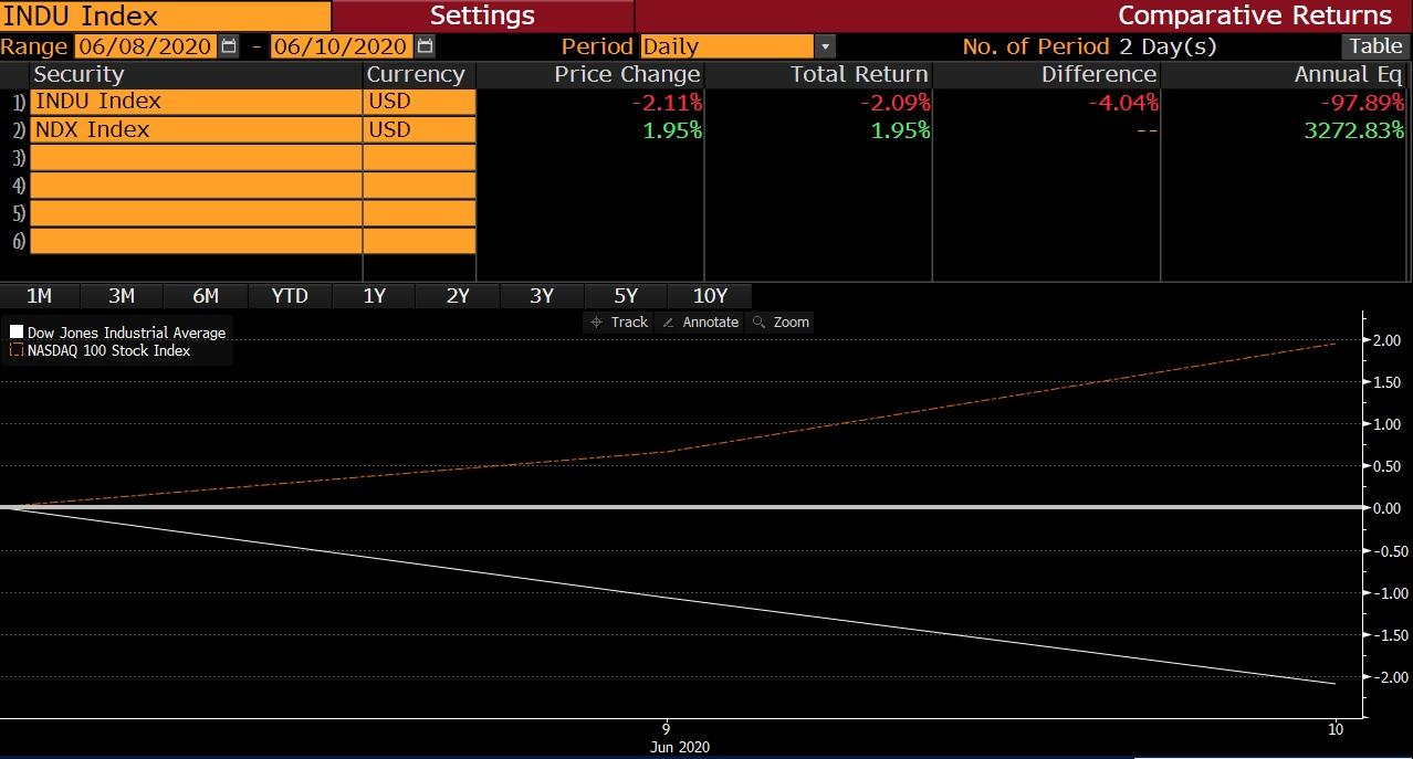 In de afgelopen dagen steeg de Nasdaq en daalde de Dow Jones. De laatste keren dat deze beweging zo sterk was, was eind jaren negentig.