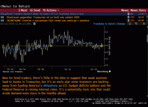 De felheid van Trump laat ook sporen na bij de vraag naar Amerikaanse staatsobligaties. Er is bij de uitgifte van nieuwe Amerikaanse staatsschuld gewoonlijk veel meer vraag dan aanbod. Die verhouding daalt de laatste tijd wat (zie grafiek). De vraag blijft het aanbod overigens wel ruim overtreffen. Het belastingbeleid van Trump veroorzaakt hogere overheidstekorten (een groter aanbod van schuld en dus hogere rentes) en ook de Fed gaat toch echt in 2018 wel drie- of viermaal haar tarieven verhogen. In een klimaat van stijgende rentes is het onaantrekkelijk om nieuwe obligaties kopen, zeker als de koers van de dollar ook onder druk staat tegenover menige andere valuta. Kortom, de vraag naar de schuld staat licht onder druk.
