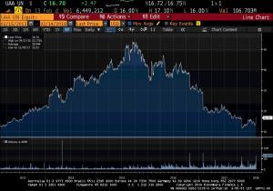 In de S&P500 was Under Armour de grootste stijger, na beter dan verwachte cijfers. Het aandeel won maar liefst 17,4% na uitbreiding van herstructureringen, kostenbesparingen en toename van omzet in Noord-Amerika. Een imposante stijging voor één dag, maar de koers van Under Armour over de afgelopen vijf jaar lijkt vooral op een grote berg. Hierin overheerst vanaf de top van $53,78 vooral het gevoel van een enorme daling, naar momenteel $16,70.
