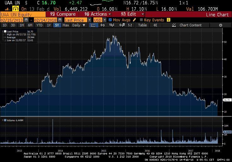 In de S&P500 was Under Armour de grootste stijger, na beter dan verwachte cijfers. Het aandeel won maar liefst 17,4% na uitbreiding van herstructureringen, kostenbesparingen en toename van omzet in Noord-Amerika. Een imposante stijging voor één dag, maar de koers van Under Armour over de afgelopen vijf jaar lijkt vooral op een grote berg. Hierin overheerst vanaf de top van $53,78 vooral het gevoel van een enorme daling, naar momenteel $16,70.