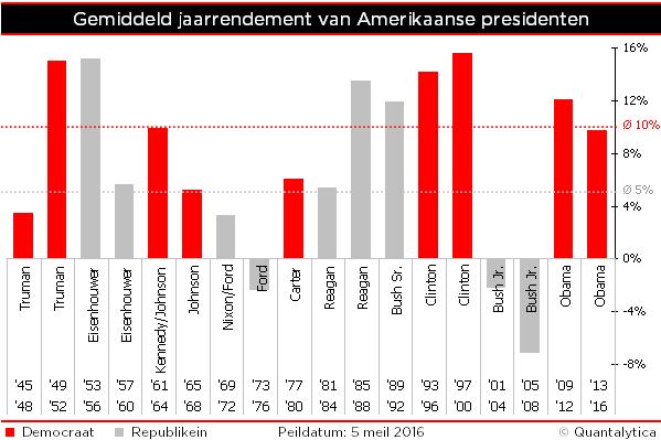 De voorverkiezingen laten uitschijnen dat de strijd om de presidentsverkiezingen gaat tussen de Democrate Hillary Clinton en de Republikein Donald Trump. Wie uiteindelijk president van de Verenigde Staten wordt, bepaalt niet alleen uw aandelenkeuze, de beurs presteert ook beter onder een Democraat.