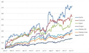 De belangrijkste Amerikaanse index, de S&P500, staat dit jaar tot dusver 18% in de plus. De Amerikaanse Nasdaq met 2560 technologieaandelen steeg 27%. De honderd grootste technologiefondsen gingen met 31% omhoog. Een portefeuille met de FANG-aandelen (Facebook, Apple, Netflix en Google) staat in 2017 zelfs 53% hoger.