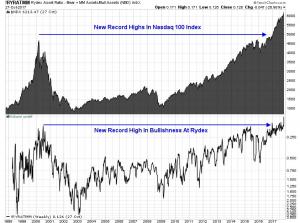 Een van mijn favoriete manieren om het enthousiasme te meten is het vermogen in verschillende fondsen van de ETF-aanbieder Rydex als maatstaf te nemen. Zij hebben iets meer dan $25 mrd onder beheer en bieden twee categorieën ETF’s aan. Dit zijn longfondsen en shortfondsen, beide met een hefboom.