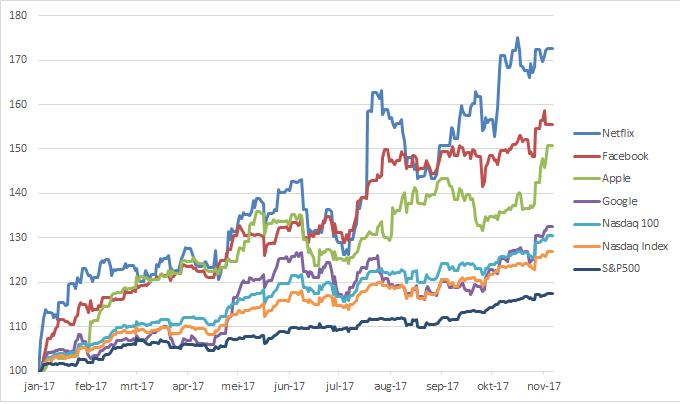 De belangrijkste Amerikaanse index, de S&P500, staat dit jaar tot dusver 18% in de plus. De Amerikaanse Nasdaq met 2560 technologieaandelen steeg 27%. De honderd grootste technologiefondsen gingen met 31% omhoog. Een portefeuille met de FANG-aandelen (Facebook, Apple, Netflix en Google) staat in 2017 zelfs 53% hoger.