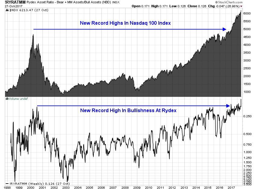 De Rydex-indicator is vorige week naar een nieuw extreem van 0,127 gegaan. Dit houdt in dat er acht keer zoveel geld zit in longfondsen als in shortfondsen. Het verleden heeft geleerd dat de rendementen tegenvallen wanneer beleggers door het dolle heen zijn.