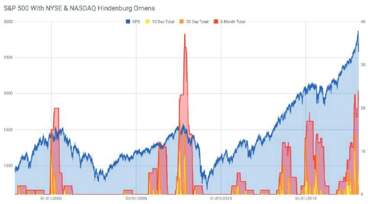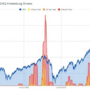 Zelfs ik als fundamenteel analist kan mij vinden in dit patroon binnen de technische analyse. Dit komt in de eerste plaats omdat ik geloof dat markten toppen over langere perioden en bodemen op slechts één dag. De bodem van de aandelenmarkt tijdens de vorige mondiale crisis lag zonder twijfel op 9 maart 2009. In de lente van 2000 topten technologieaandelen, terwijl de hoofdindices in de herfst topten. Ditzelfde was in 2007 aan de hand. Aandelen van financials bereikten hun hoogste koers in de lente en de hoofdindices in de herfst. In de afgelopen zes maanden zijn er in de S&P500, Nasdaq en New York Composite Index meer dan twintig Hindenburg Omen-patronen geweest. De laatste keren dat dit ook voorviel was in 2000 en in 2007 (zie grafiek). De Amerikaanse aandelenmarkt is zonder twijfel aan het verzwakken.