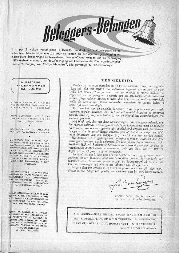 ‘Ons bescheiden verenigingsorgaan is uitgegroeid tot een financieel blad van behoorlijke omvang dat aandacht kan schenken aan de actuele gebeurtenissen op beleggingsgebied en voor de lezer een wegwijzer wil zijn in het labyrint van de effectenwereld.’ Aldus het ‘Ten Geleide’ van de hand van de voorzitter van de Vereniging van Effectenbescherming en de Vereeniging van Fondsenhouders in het proefnummer van Beleggers-Belangen, half december 1956.