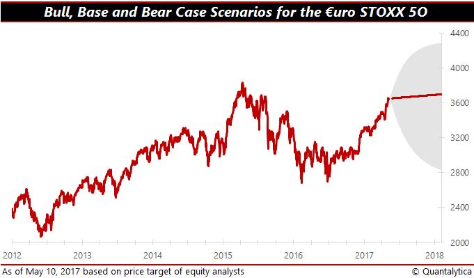 En wat de Euro STOXX 50 betreft, daar spiegelt het optimistische scenario van aandelenanalisten een stijging van 18,2% voor en waarschuwt het bear-scenario voor een daling van 24,8%.