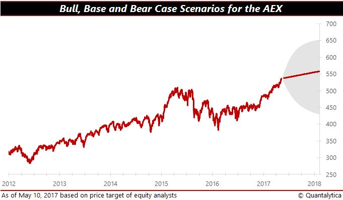 Dataleveranciers als Bloomberg en Reuters houden minutieus de beleggingsadviezen van analisten bij. Aan de hand daarvan blijkt dat Nederlandse aandelen over een jaar zo’n 6% hoger noteren dan nu. Het gemiddelde koersdoel laat zien dat de AEX volgend jaar rond deze tijd zo’n 565 punten zal doen. Het koersdoel van de Euro STOXX 50 wordt gezien bij 3715 punten, wat neerkomt op een winst van nauwelijks twee procent.