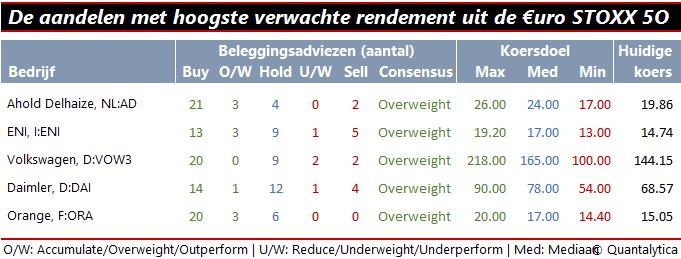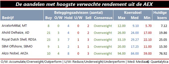 Op basis van het gemiddelde koersdoel met de mediaan als centrummaat blijkt dat van de Nederlandse hoofdfondsen de aandelen van ArcelorMittal, Ahold Delhaize, Royal Dutch Shell het hoogste rendement in het vooruitzicht stellen.